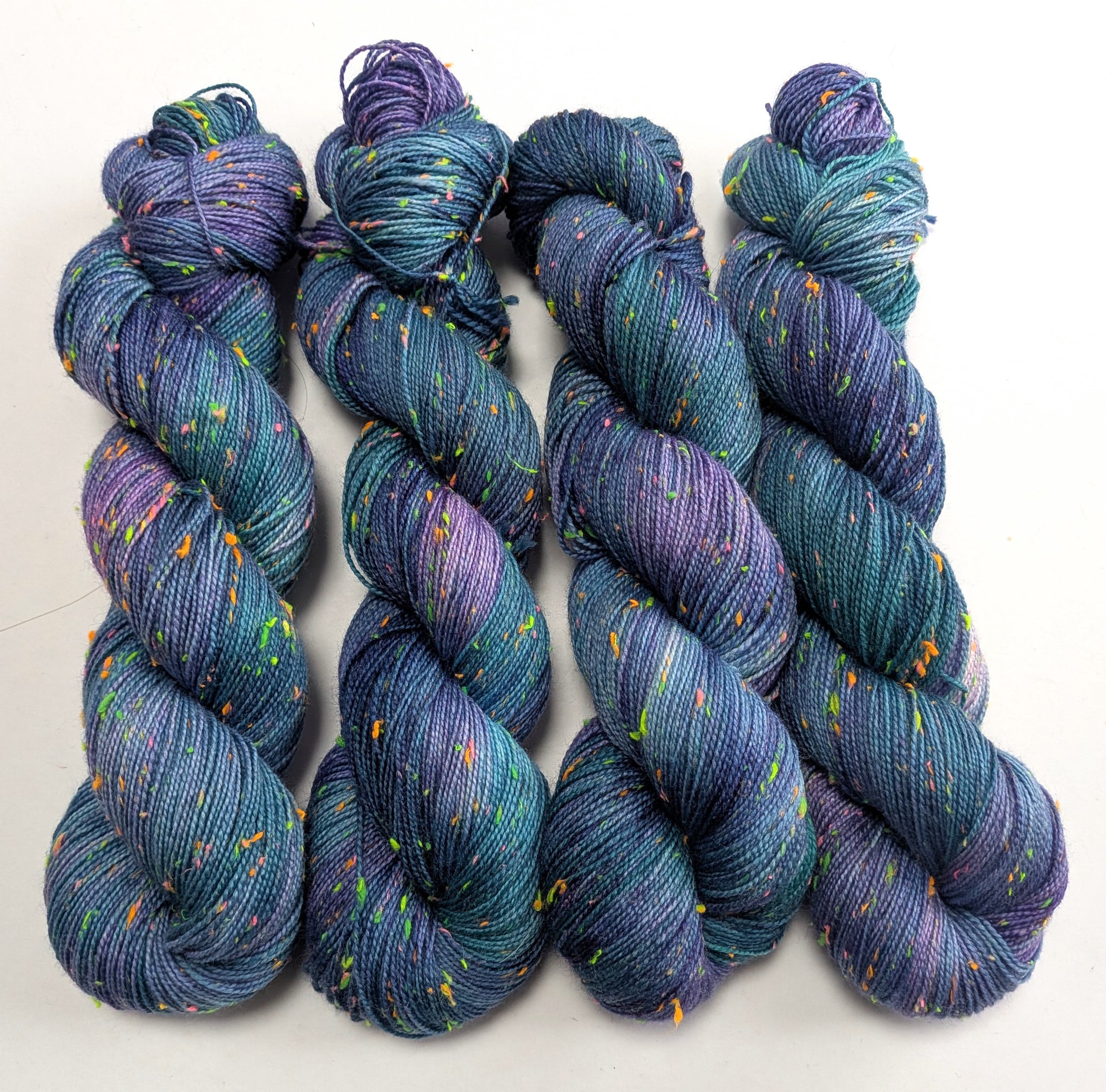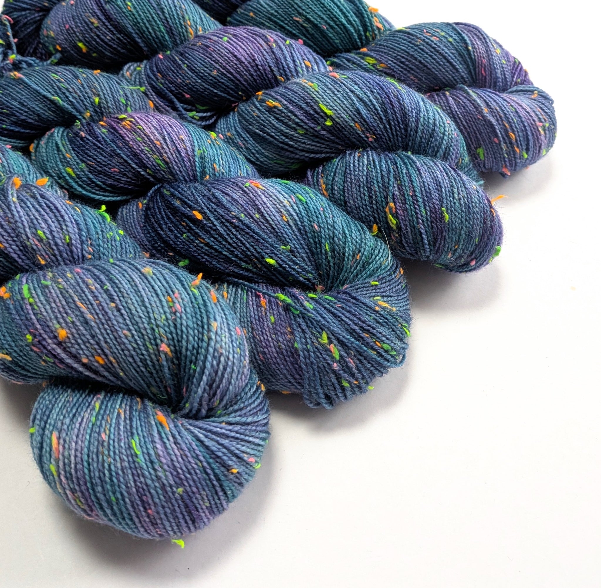 This is a base of 85% superwash merino/15% neon Donegal neps. It is a sock/fingering/4-ply weight yarn.
