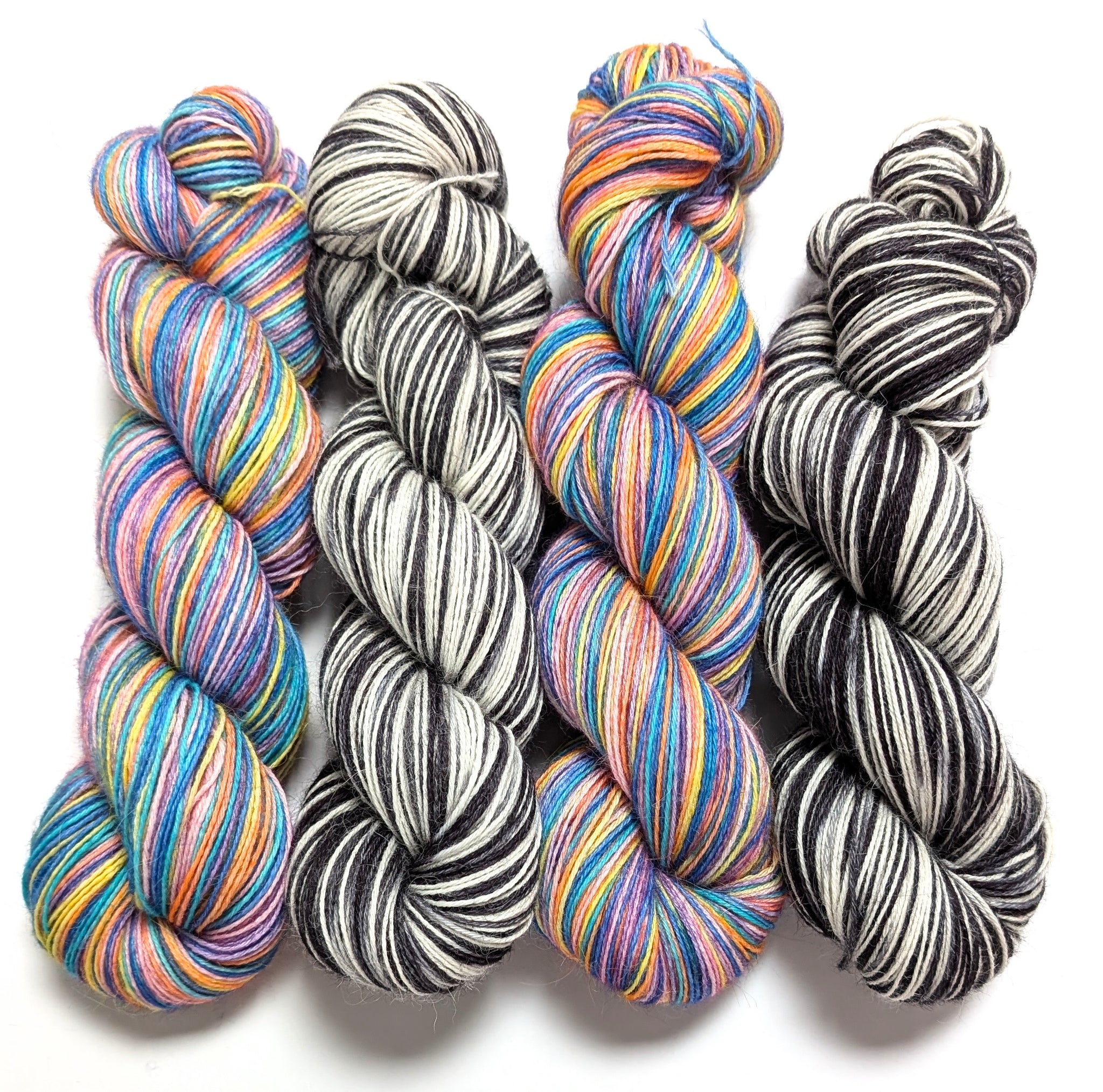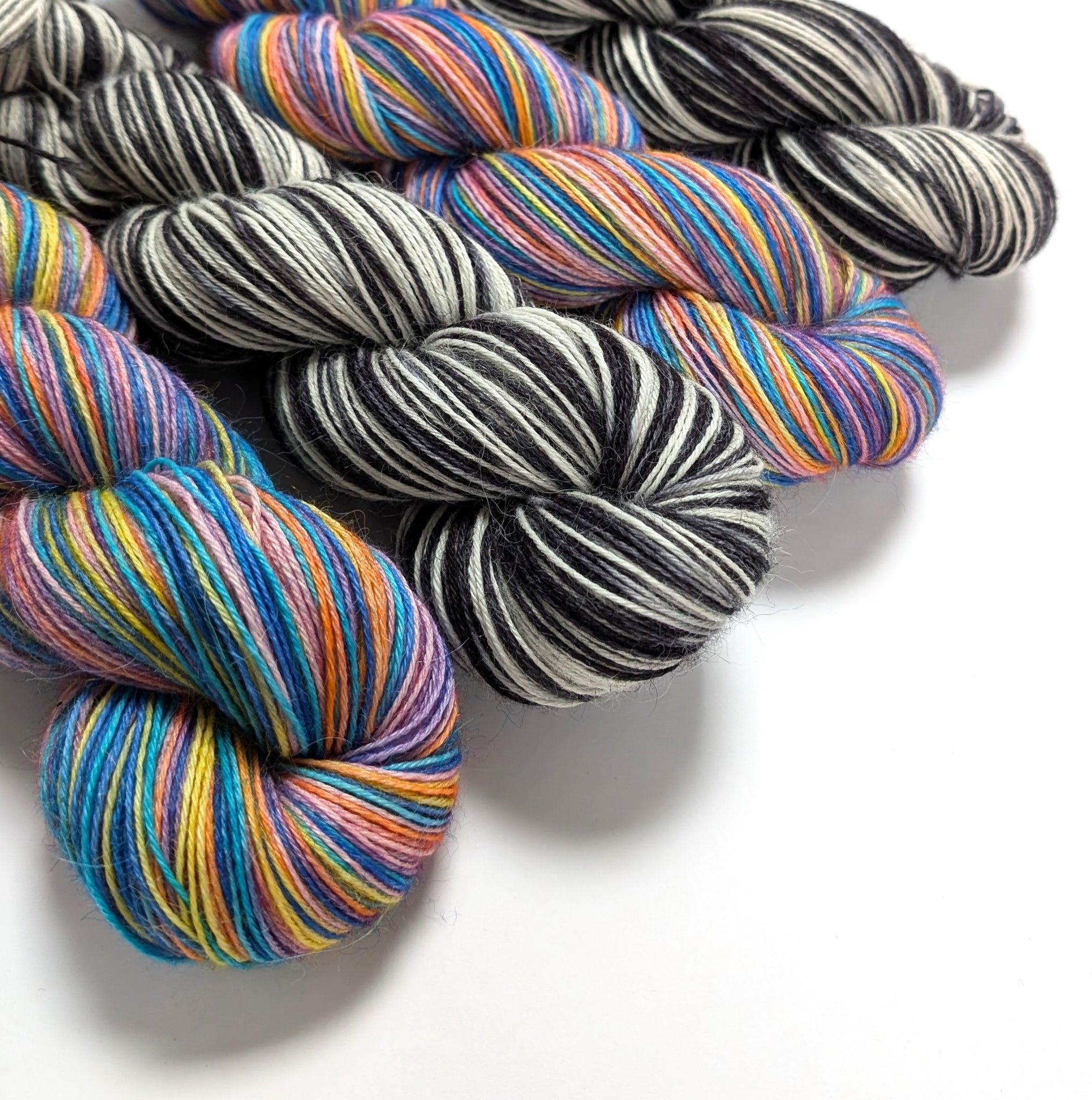 Wednesday's Window consists of 2 x 100g variegated skeins - one in blues, purple, pink, orange and yellow, and the other in black and white.