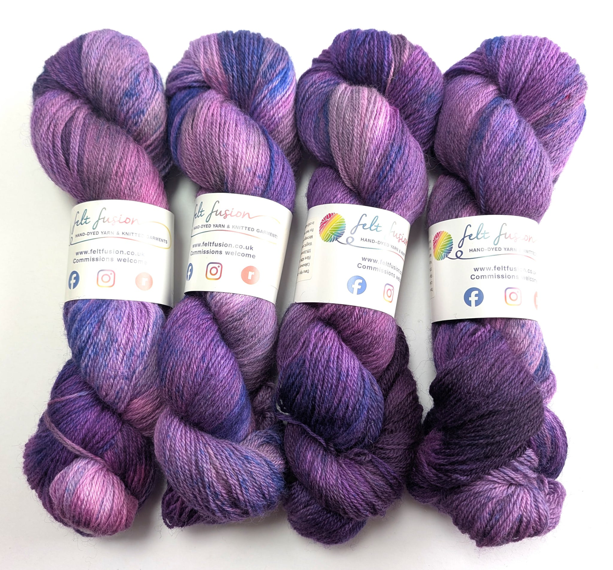 This base is my exclusive Danu 4ply. A non superwash British wool blend of 40% Blue Faced Leicester/40% Romney/10% Exmoor Blueface/10% Silk. A 4ply/fingering weight yarn.