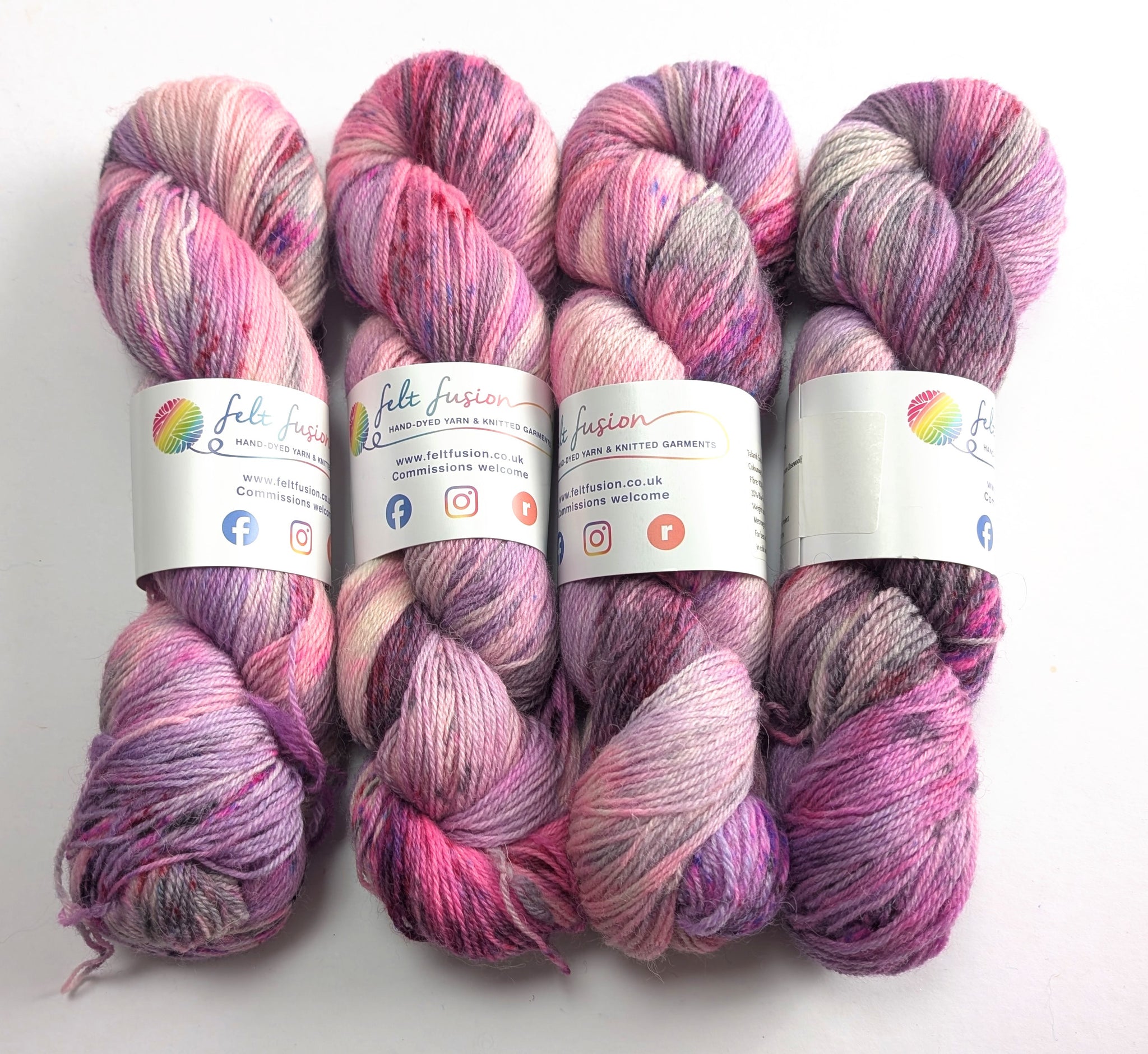 Four skeins of pink yarn with labels on a white background