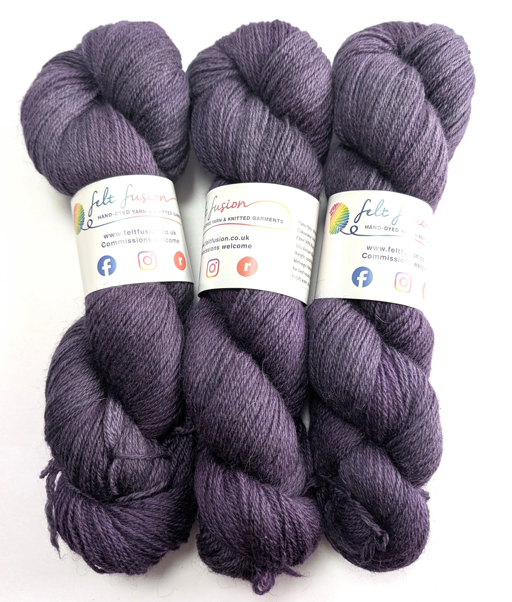 My exclusive base - Danu 4ply. A non superwash British wool blend of 40% Blue Faced Leicester/40% Romney/10% Exmoor Blueface/10% Silk. A 4ply/fingering weight yarn.