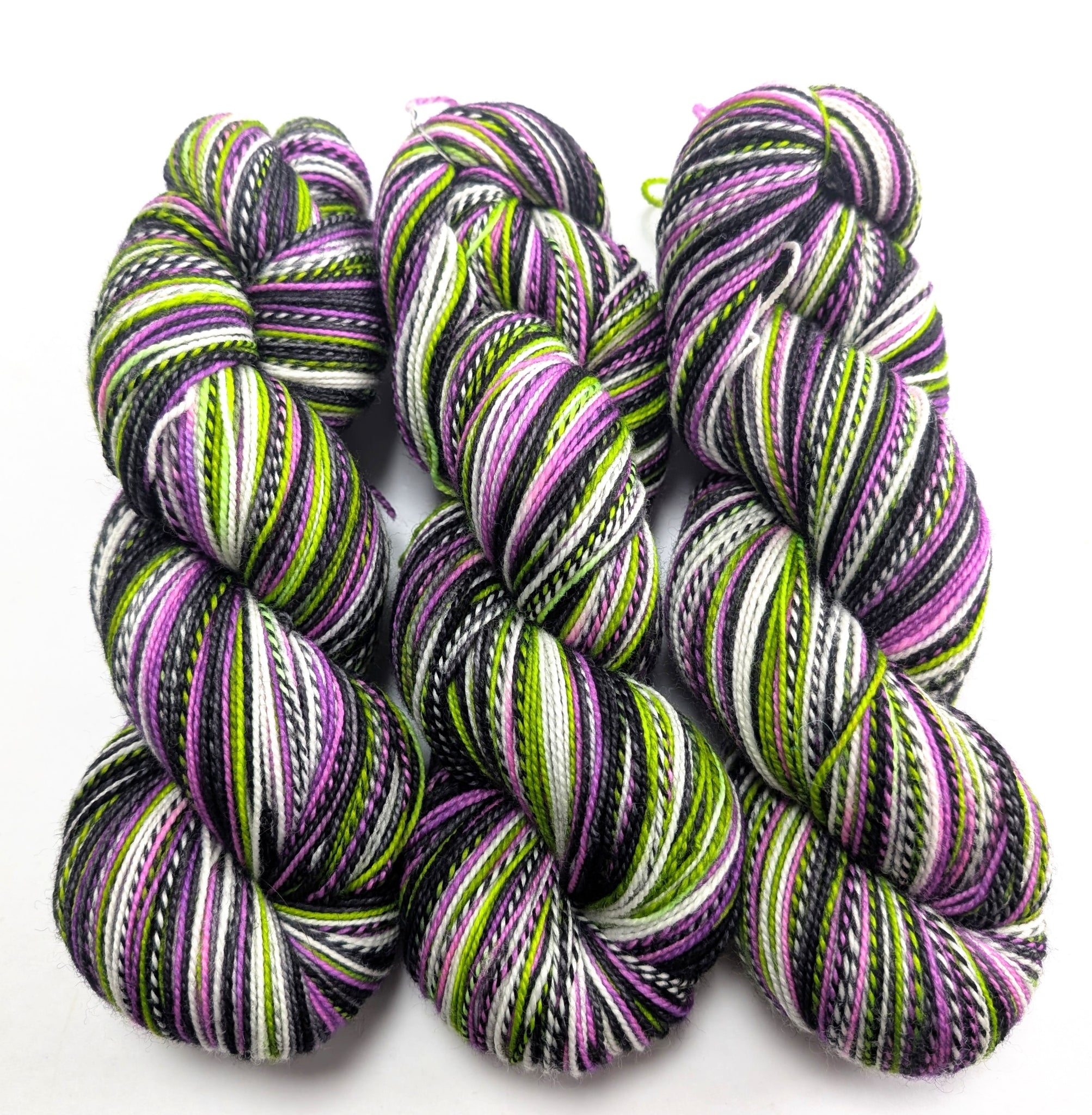 This base is a blend of 80% superwash merino/20% nylon that has a high twist due to the spinning process. Black is included in the spinning, giving a zebra effect. It is a sock/fingering/4-ply weight yarn.