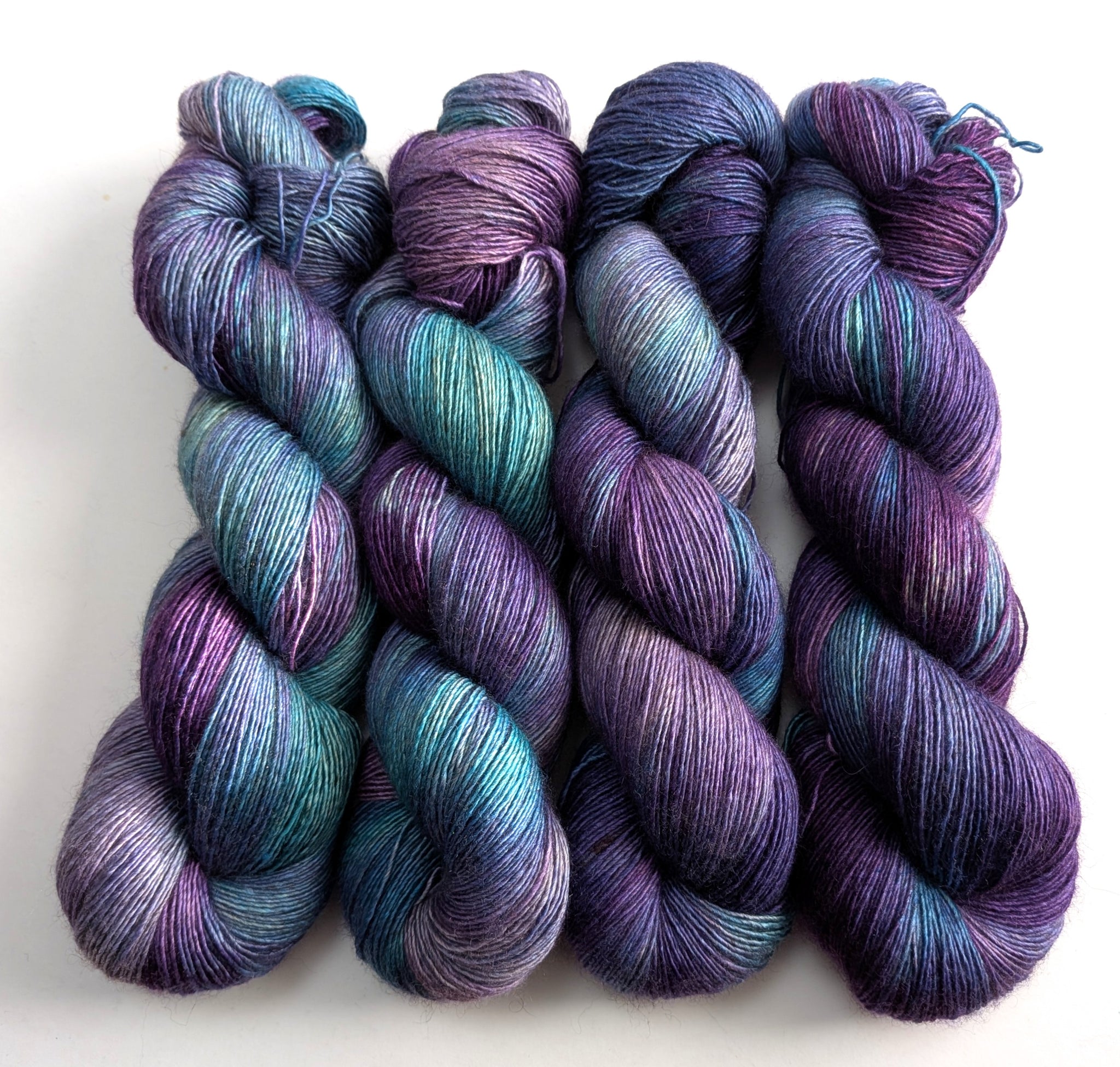 Frankenskein on superwash merino/silk/yak 4ply singles. 120g.