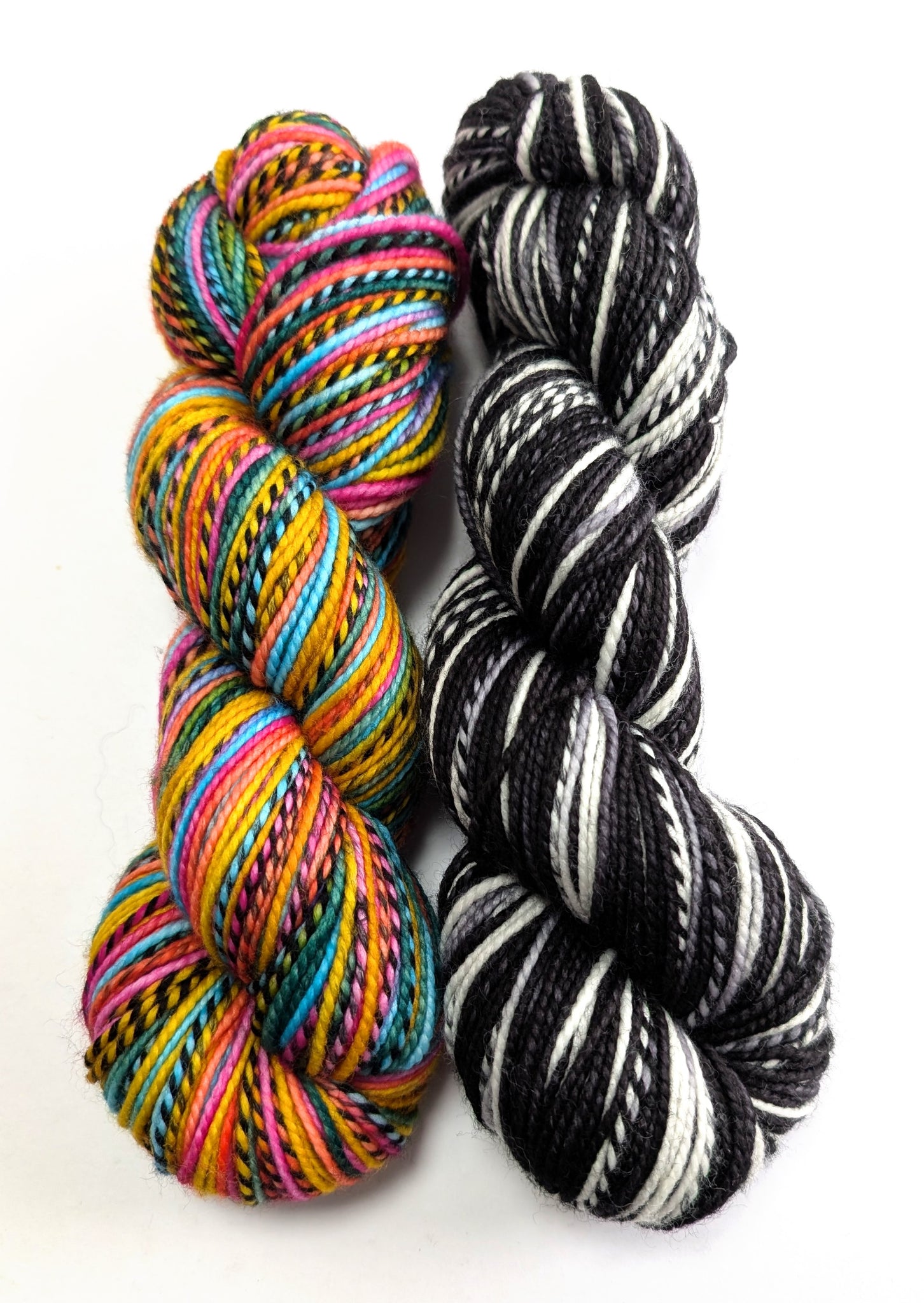 This base is a blend of 80% superwash merino/20% nylon that has a high twist due to the spinning process. Black is included in the spinning, giving a zebra effect. This is a DK weight yarn.