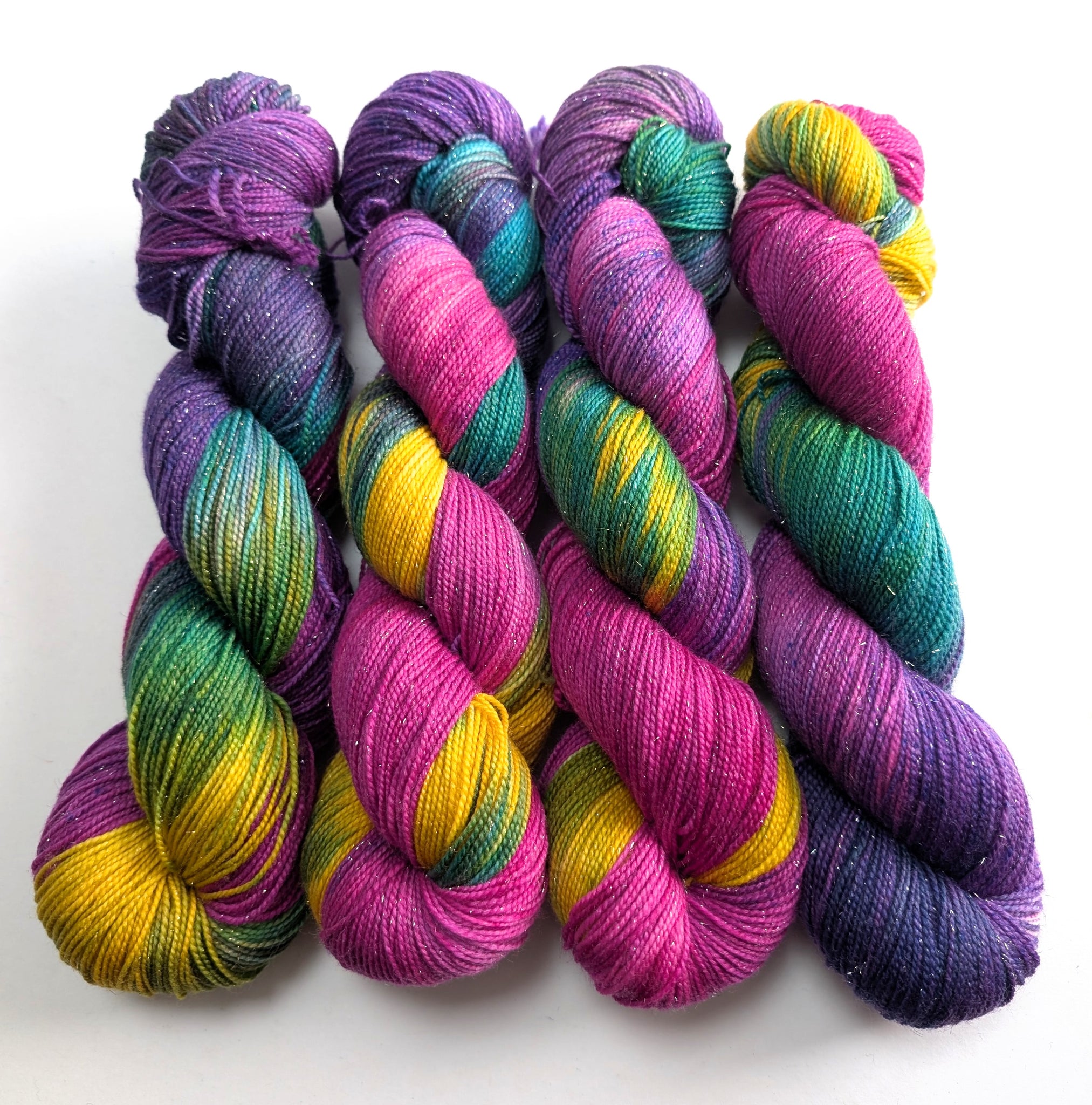This base is a 75% superwash merino/20% nylon/5% silver stellina sparkle sock/fingering/4-ply yarn.