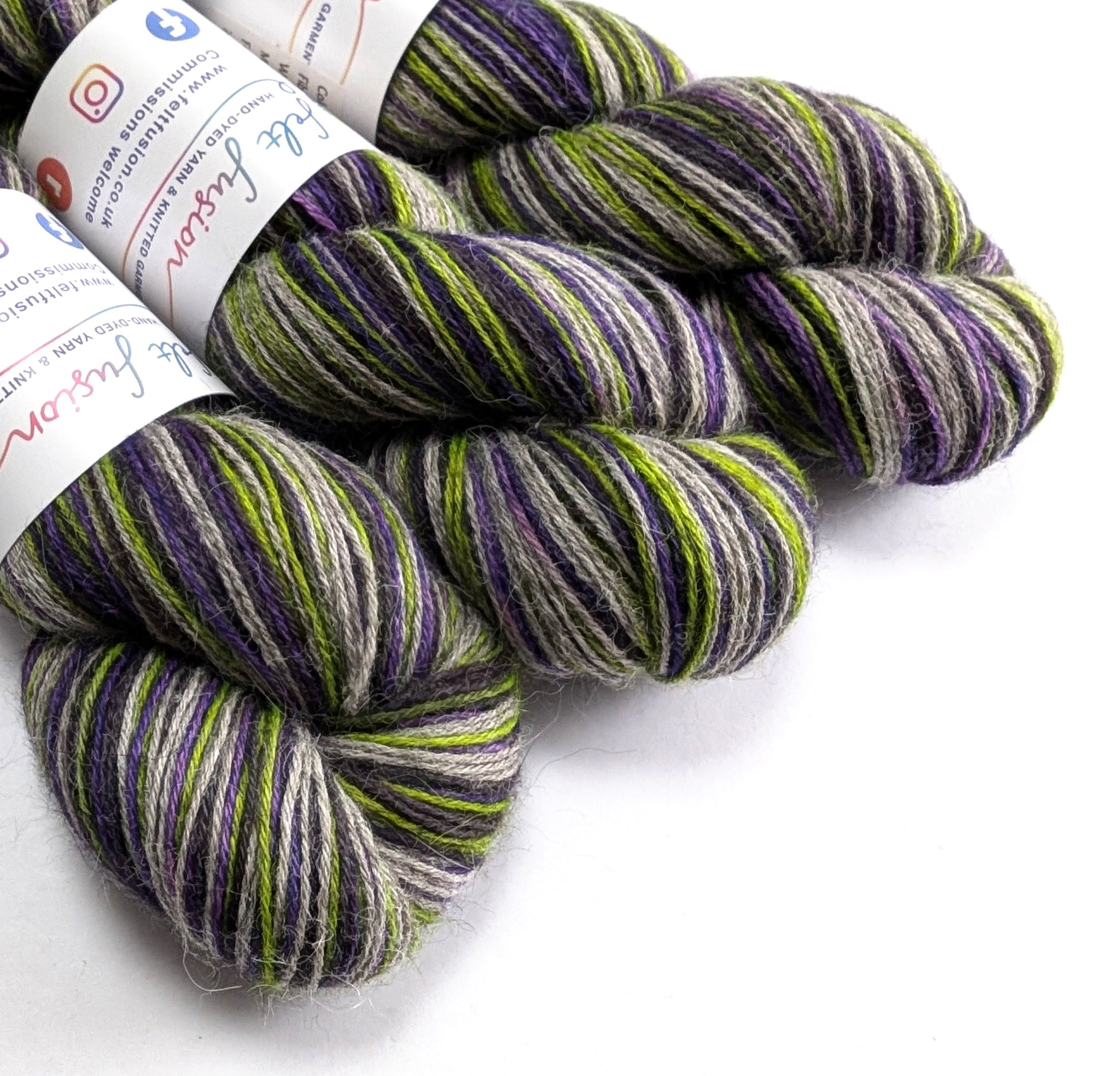 Beetlejuice is a variegated colourway featuring purple, green, black and greys.
