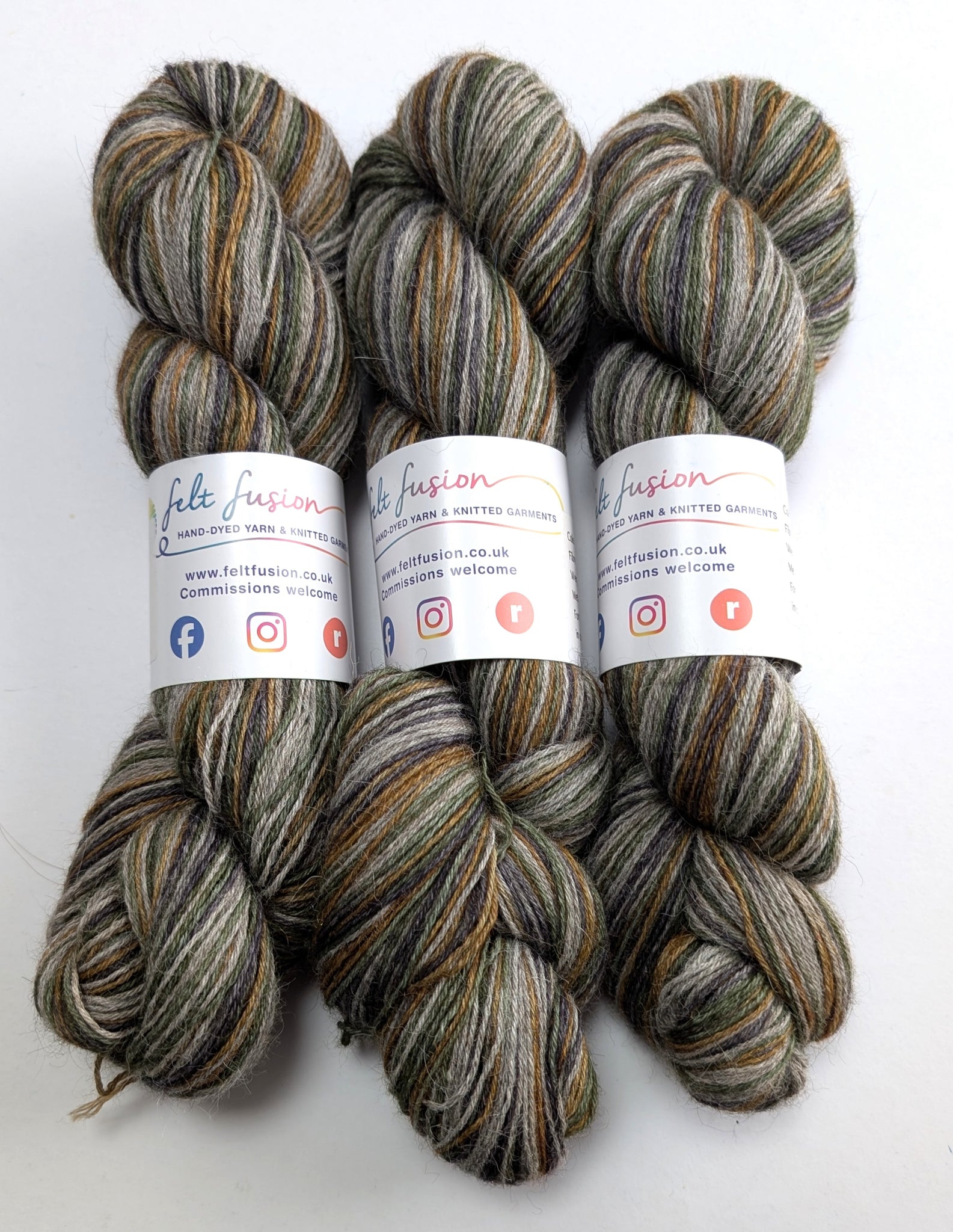 Gruff is a variegated colourway featuring brown, green and greys.