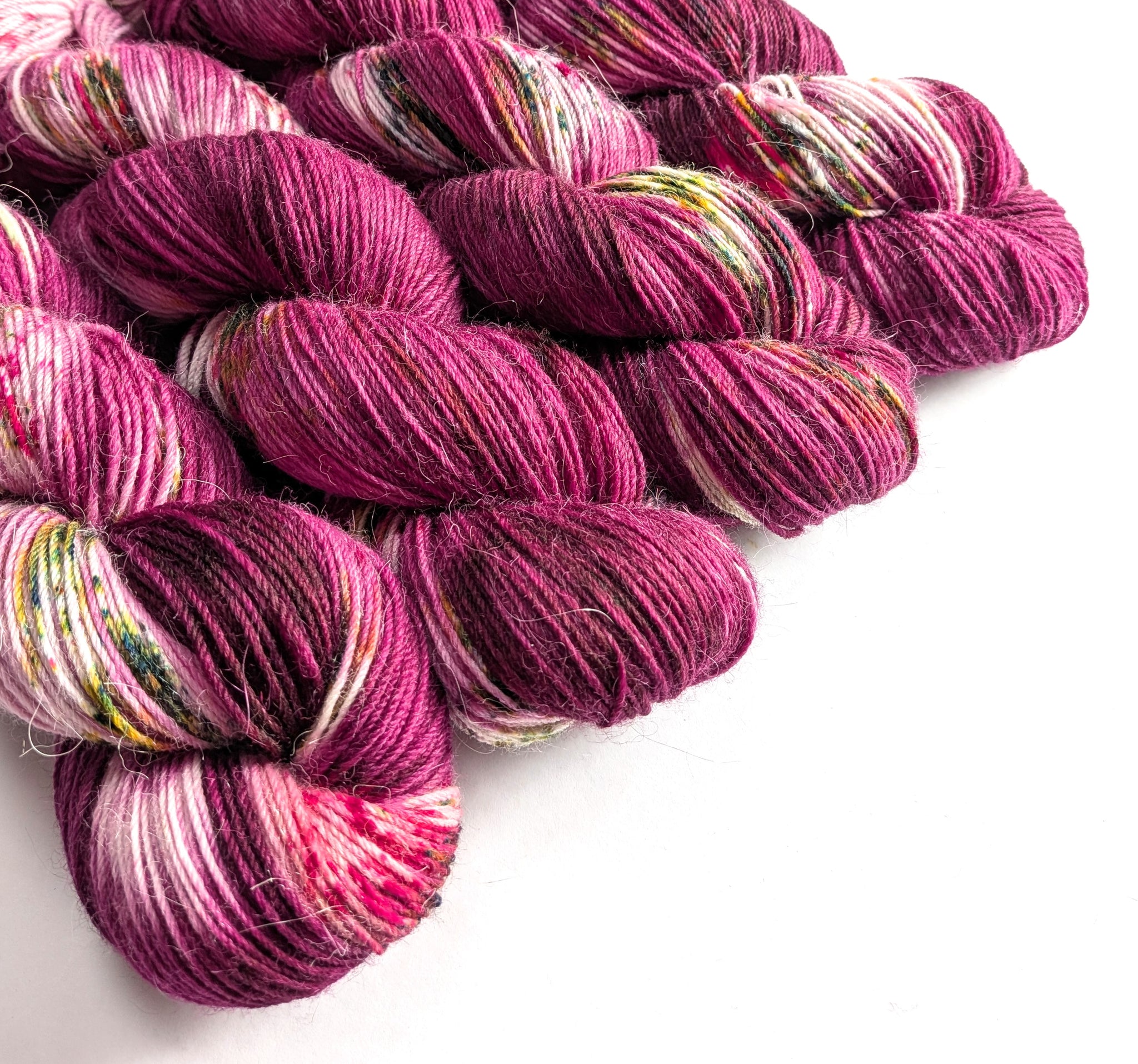 • Load image into Gallery viewer, Skeins of pink and purple yarn with speckles on a white background