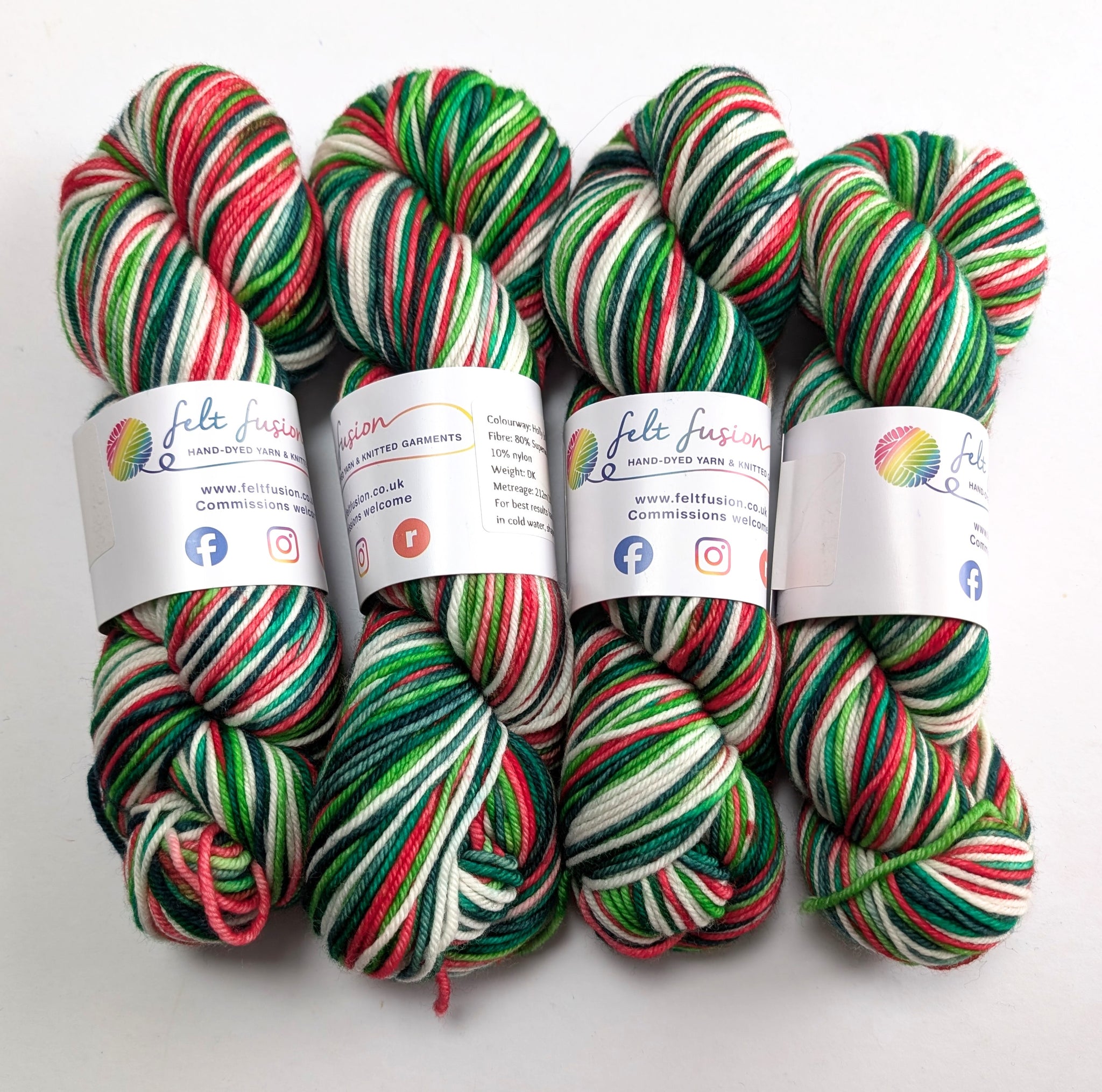 Holly Jolly Christmas is a variegated colourway with greens, red and white (natural).