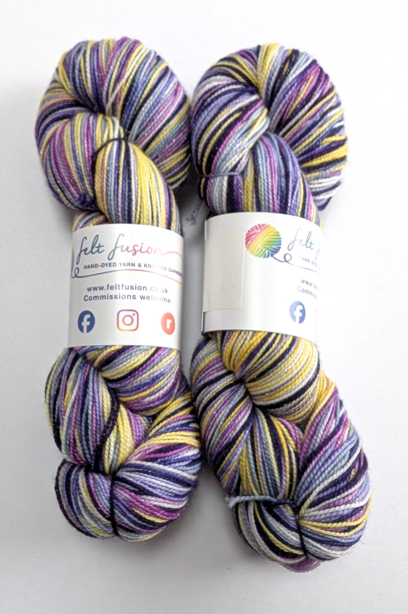 Iris is a pretty variegated colourway, with shades of purple, navy blue and yellow.
