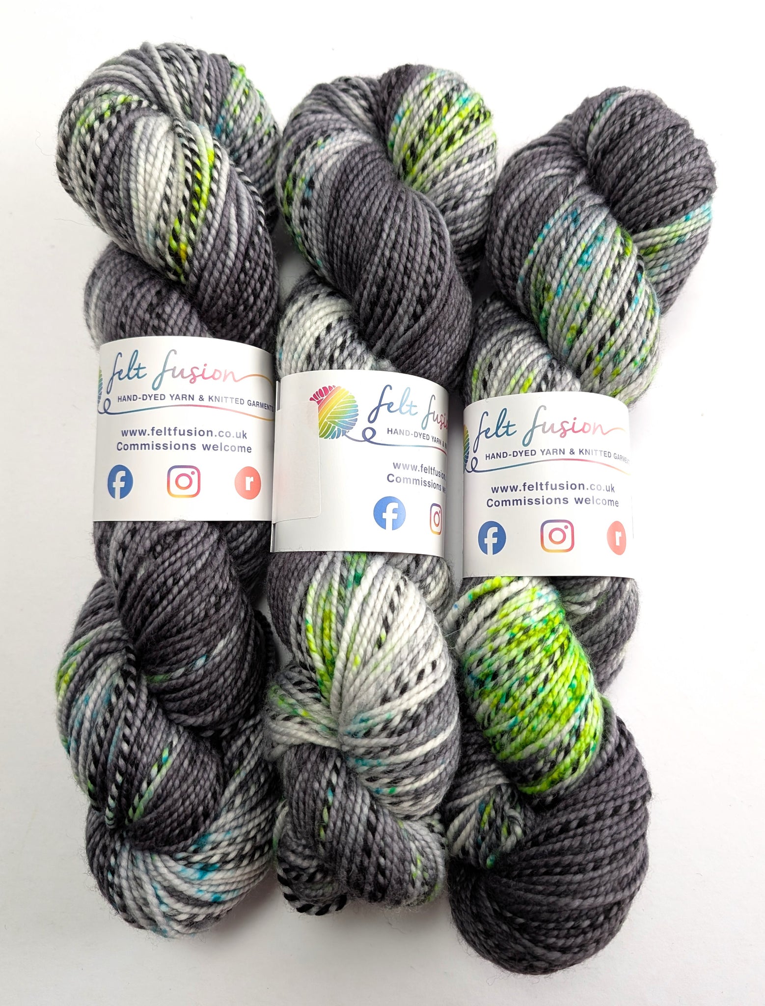 This base is a blend of 80% superwash merino/20% nylon that has a high twist due to the spinning process. Black is included in the spinning, giving a zebra effect. This is a DK weight yarn.