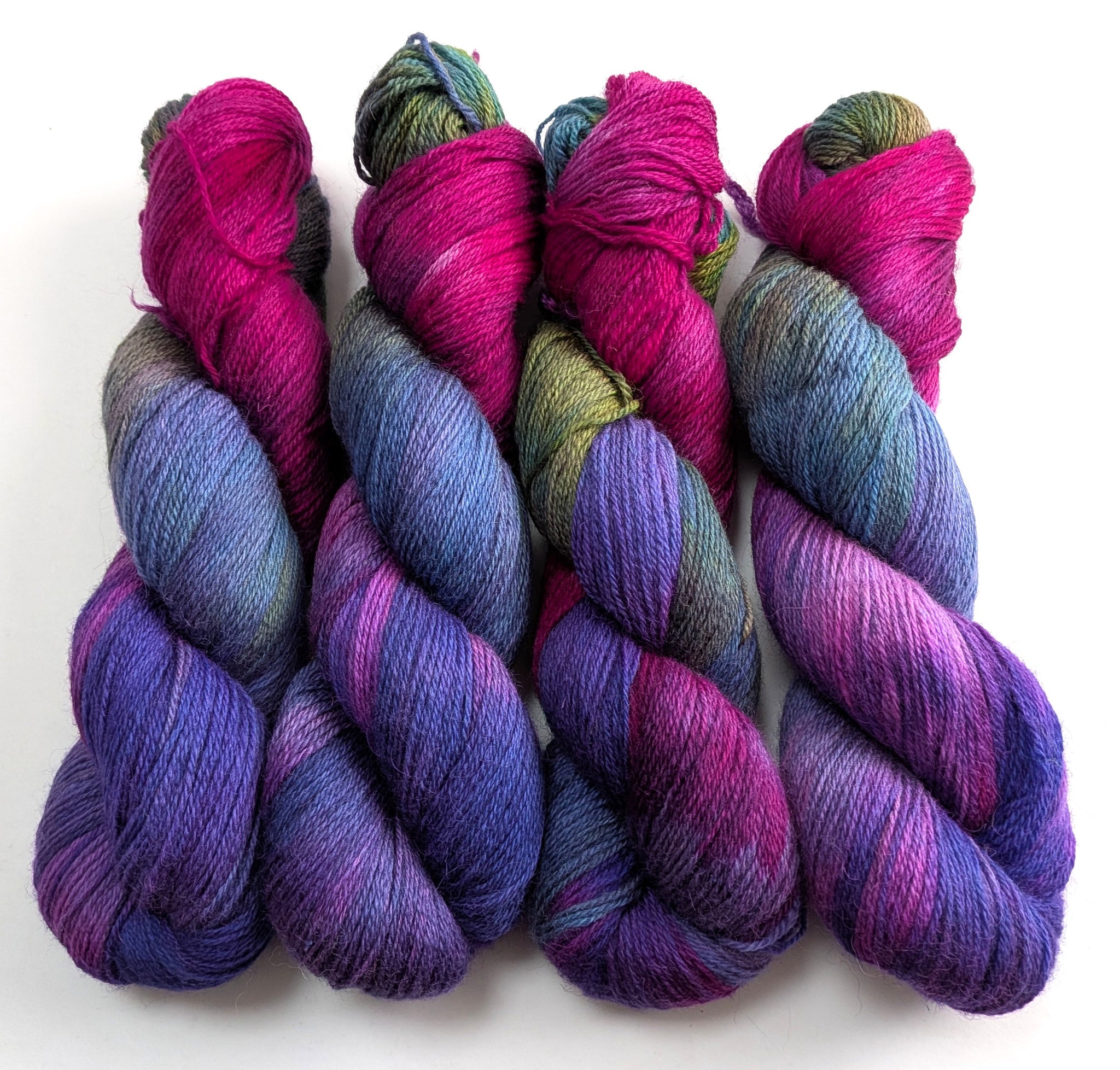 Peacock is a variegated colourway, with purple, pinks, blues and greens.