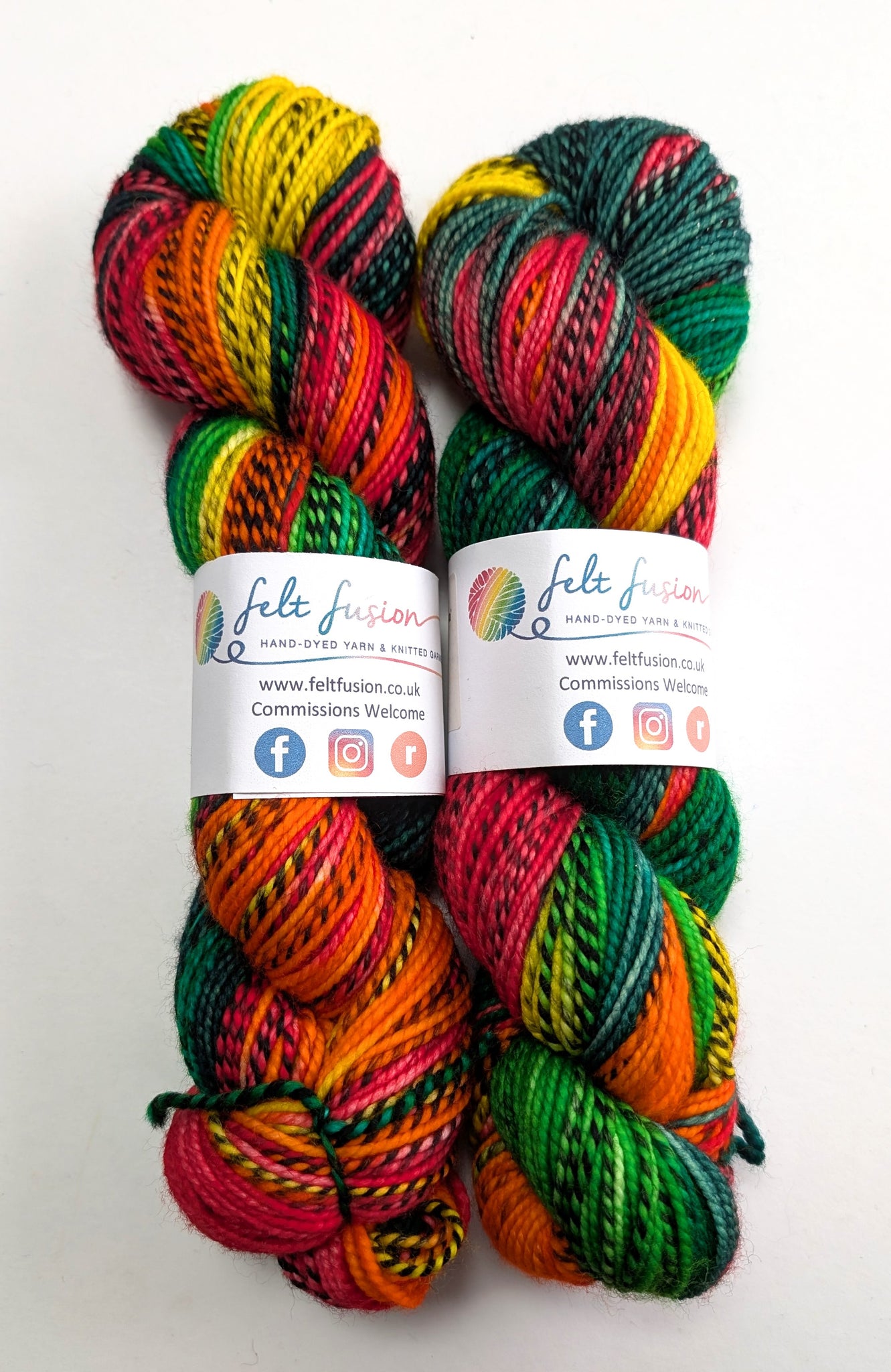 This base is a blend of 80% superwash merino/20% nylon that has a high twist due to the spinning process. Black is included in the spinning, giving a zebra effect. This is a DK weight yarn.
