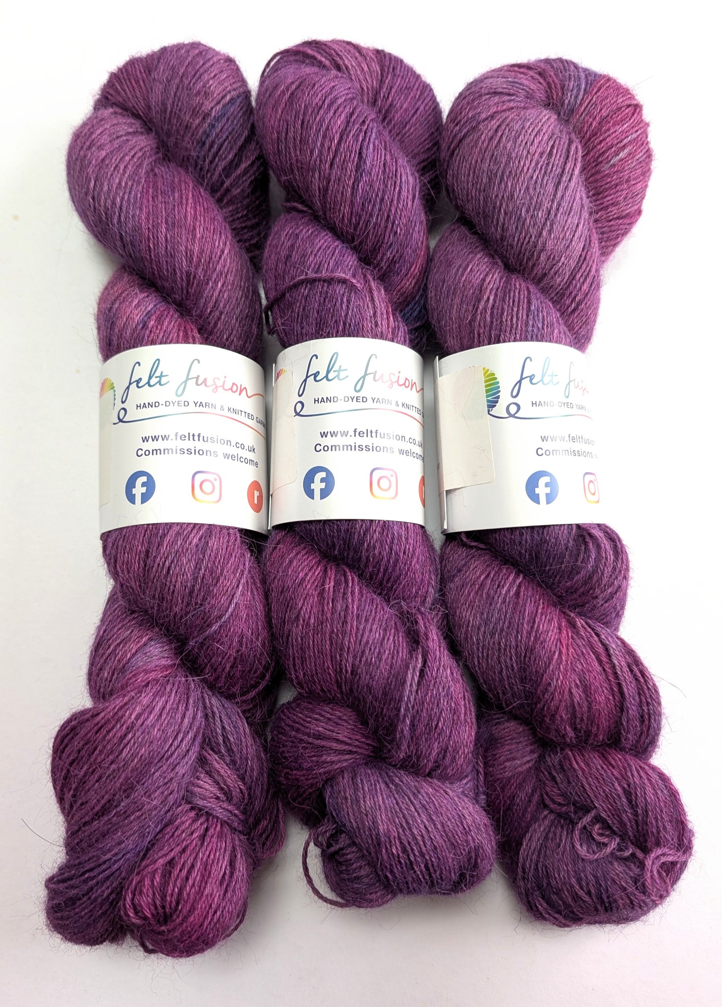 Purple Haze on 100% llama 4ply/fingering weight yarn. Grey base.