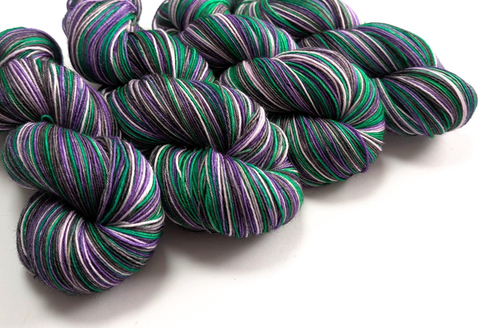 Witches' Brew is a variegated colourway featuring purples, green and black/dark grey.