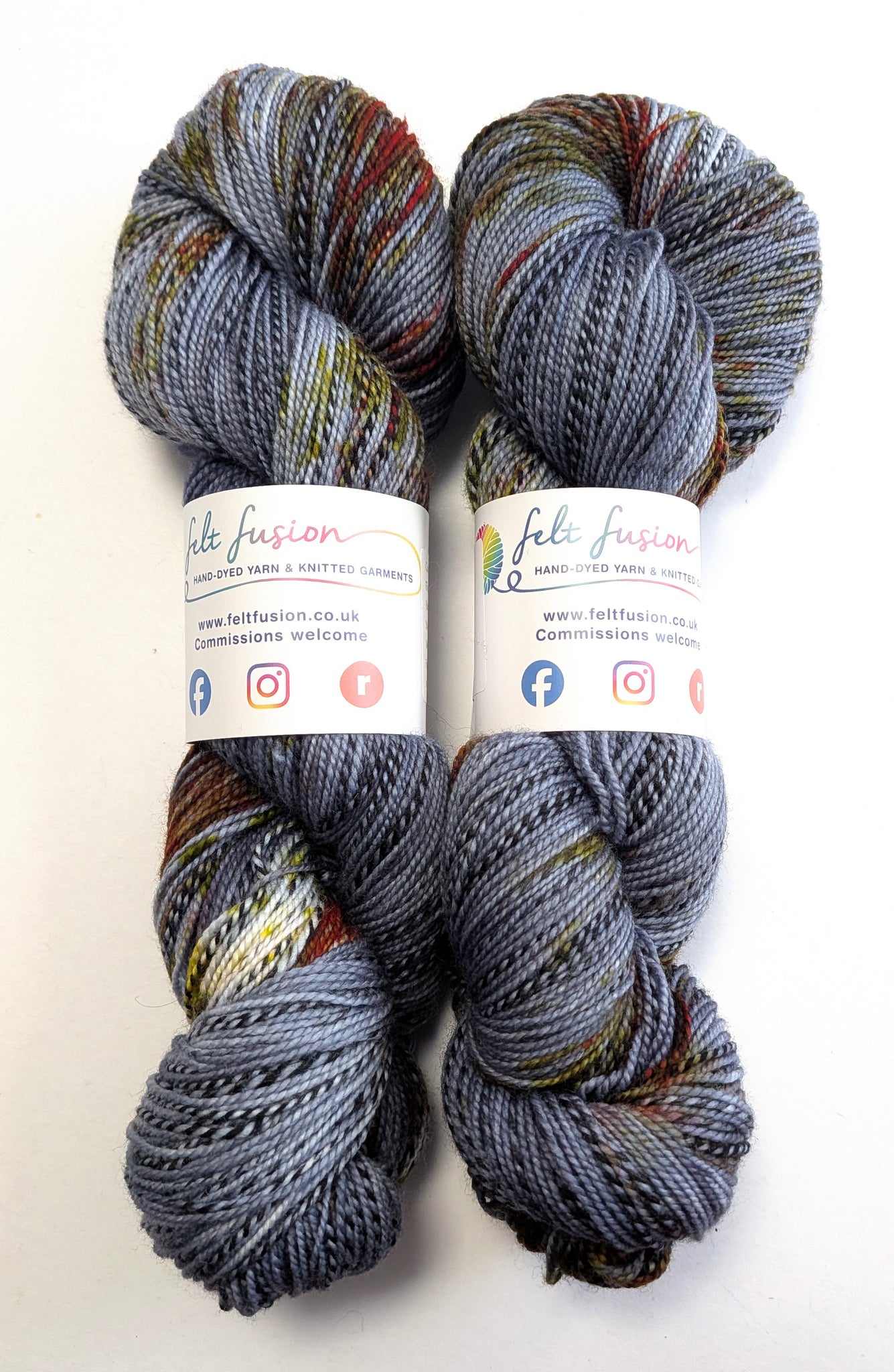 This base is a blend of 80% superwash merino/20% nylon that has a high twist due to the spinning process. Black is included in the spinning, giving a zebra effect. It is a sock/fingering/4-ply weight yarn.